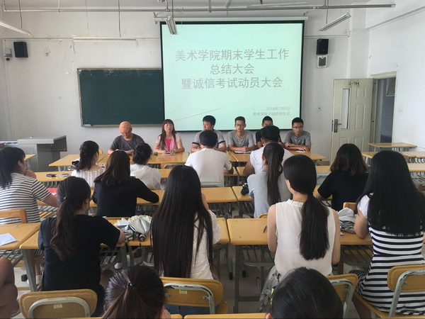 2016年7月5日中午,美术学院在1-704召开期末学生工作总结大会暨诚信考试动员大会。大会由学生办公室主任唐艳丽老师主持,副院长仇宇老师、团总支书记匡扶老师、学生会成员、全体学生干部及各班班委共30多人参会。