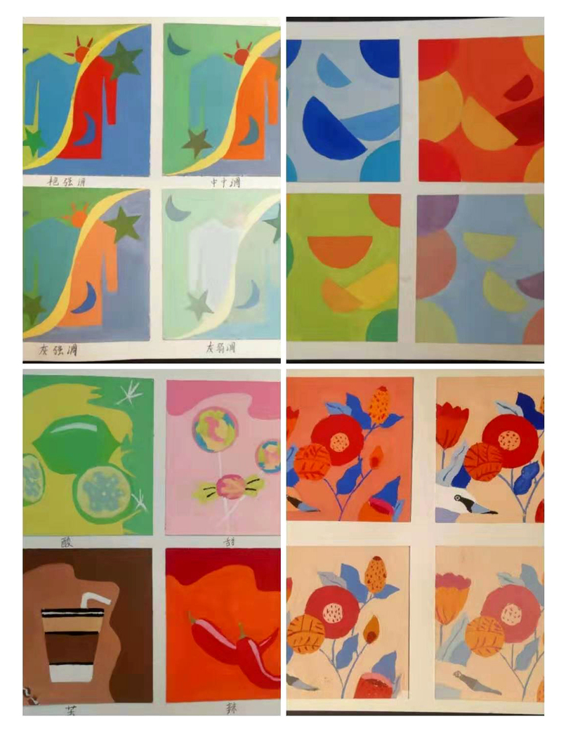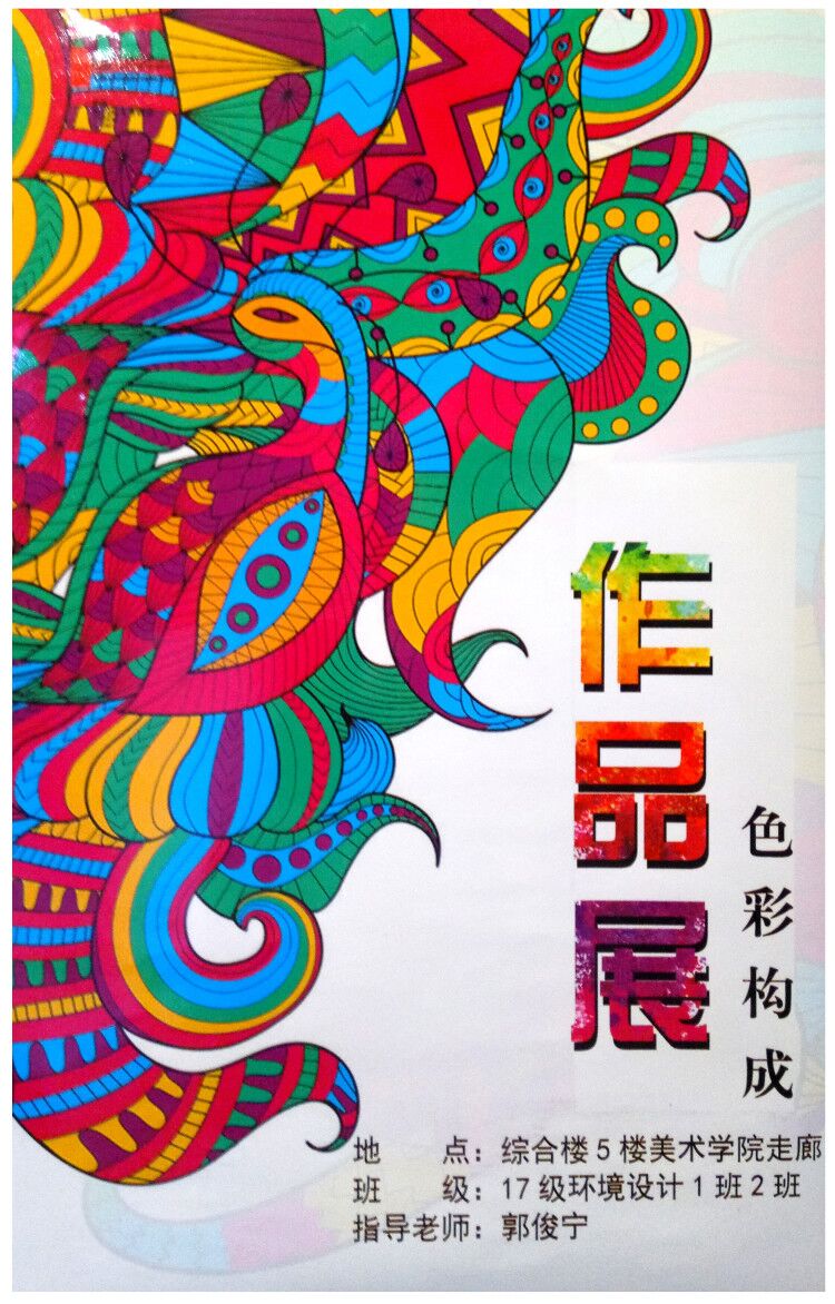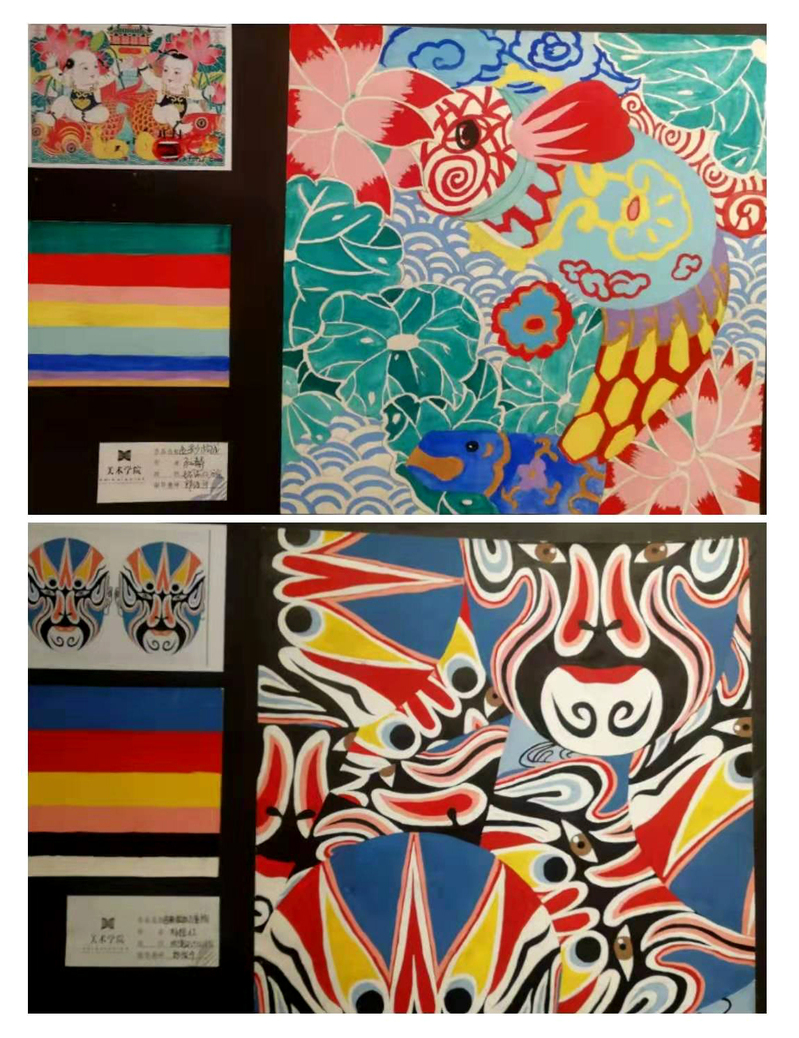 《色彩构成》是环境设计专业的专业基础课程。主要内容包含:色彩三要素,色彩的对比和调和,色彩的采集和重组。本次展览呈现了环境设计两个班级60多名同学的部分色彩作品,数量多,内容丰富,其中以民间美术色彩为题材的色彩重构作品为此次展览的重点。