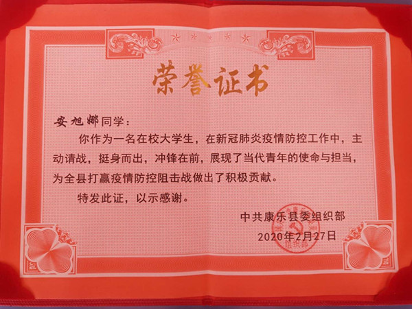 团员安旭娜积极配合所在村委会做好外来人员信息登记、劝返车辆、宣传防疫知识以及挨家挨户进行消毒等工作,凭着踏实肯干的精神,她得到了中共康乐县委组织部的嘉奖。家境本就不富裕的宁秉文主动将卖粮换来的500元钱捐给武汉,面对邻里的疑惑,他表示作为老团员,国家有难,去不了一线,心里很不安,只能做一些力所能及的事。
