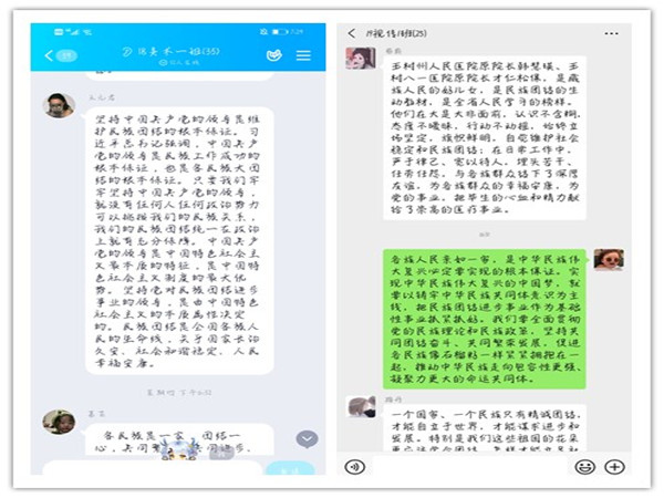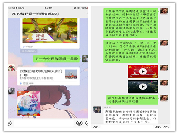 学院分团委依托班级qq群、微信群,组织学生学习贯彻习近平总书记关于民族工作重要论述和在全国民族团结进步表彰大会上的重要讲话精神,充分了解甘肃省第17个民族团结进步宣传月活动实施方案,增强广大学生民族团结进步的责任感和使命感。2019级环境设计一班学生在群内分享“五十六个民族同唱一首歌”、“民族团结方阵走向天安门广场”小视频,发表个人对民族团结重要性的认识,少数民族学生分享家乡的风俗习惯;2019级视觉传达设计一班学生分享民族团结好故事。其他各班也开展了形式多样的活动,营造良好的舆论氛围。