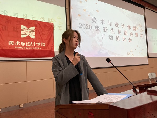 李院长首先对新生们的到来表示欢迎,并介绍到场的领导班子成员及教师。仇院长详细介绍了学院的历史沿革、办学特色、培养目标、教学条件及近几年来取得的成绩,希望同学们珍惜难得的读书时光,努力探索,敬畏专业,养成良好的学习习惯,处理好与老师同学的关系,严于律己、苦练本领,在各个方面取得优异成绩。2018级环境设计1班朱大海和2020级视觉传达设计2班何珺茹分别作为往届生和新生代表发言。