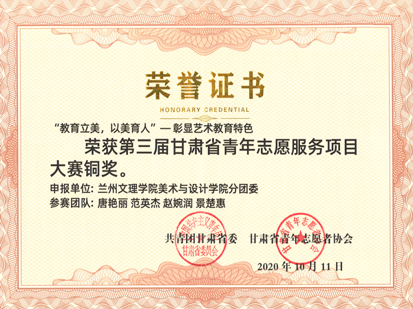 10月11日上午9:30分,第三届甘肃省青年志愿服务项目大赛颁奖仪式庄严举行。本次大赛设有金奖、银奖、铜奖和优秀奖四类奖项,其中十大买球的正规网站申报项目“教育立美,以美育人”——彰显教育艺术特色取得了铜奖的优异成绩。