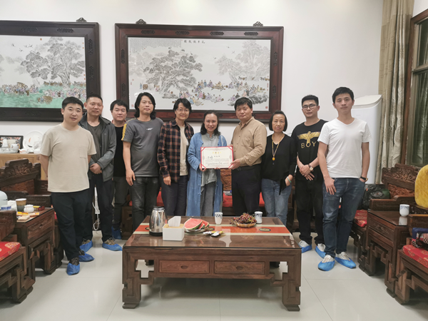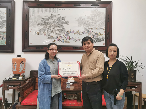 李文跃教授向弟子荣梅颁发证书并寄语:“薪火相传 不辱使命”,勉励荣梅老师一定要发扬老一辈艺术家不怕苦不怕累的精神,虚心学习,刻苦钻研技艺,在传承中华民族优秀传统文化方面与景德镇陶瓷艺术交流方面为学校和社会多做贡献。不断提升瓷画技能,青出于蓝而胜于蓝,在手工制瓷技艺这个大舞台上闯出属于自己的天地。