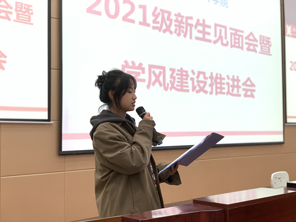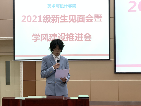 2020级环境设计2班学生朱昇鳌、2021级戏剧影视美术设计班学生徐雅蓉分别代表在校生和新生发言。朱昇鳌介绍了自己在学院学习和生活方面的情况,分享了作为班干部的成长感悟,新生也表达了对大学生活的美好憧憬和作为新时代青年不懈奋斗的坚定信念。