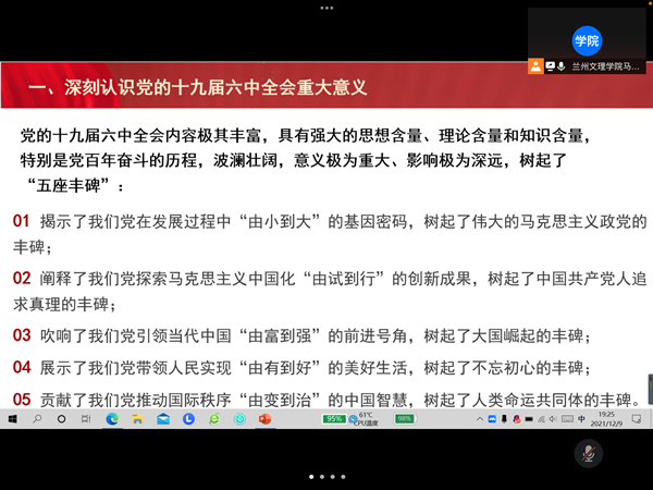 为深入学习宣传党的十九届六中全会精神,深入推进党史学习,深刻把握党百年奋斗的初心使命和重大意义,12月9日晚7点-9点,十大买球的正规网站党总支特邀马克思主义学院孙红英教授为2018级和2021级在校生开展关于十九届六中全会精神学习的专题讲座,共计300余人参加学习。