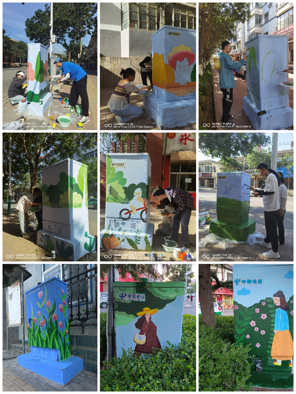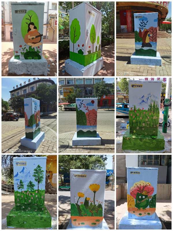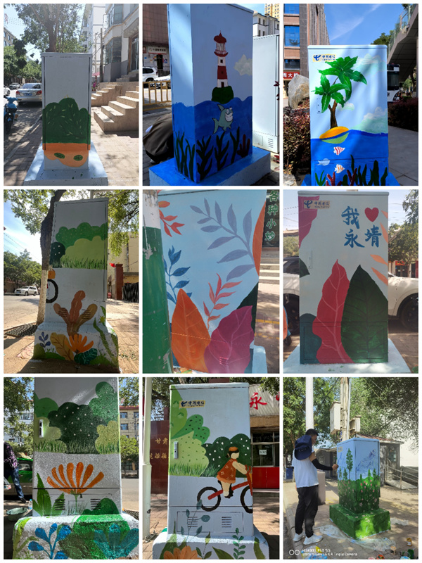 此次活动以表现永靖县刘家峡自然景观、人文景观为主题,把郁金香、薰衣草、鞭马草花海的壮观景象,以及自然人文风光“十里柳林”、藏汉合璧的罗家洞寺、炳灵寺石窟、刘家峡水电站、太极湖等本地的人文景观名片,用绚丽的的色彩和构图,以墙绘的艺术形式为载体,将这些地标景观生动地呈现在街道两旁电箱上。这不仅推动当地乡村建设,美化村容村貌,同时为同学们和当地的人民群众都上了一堂“大思政课”。