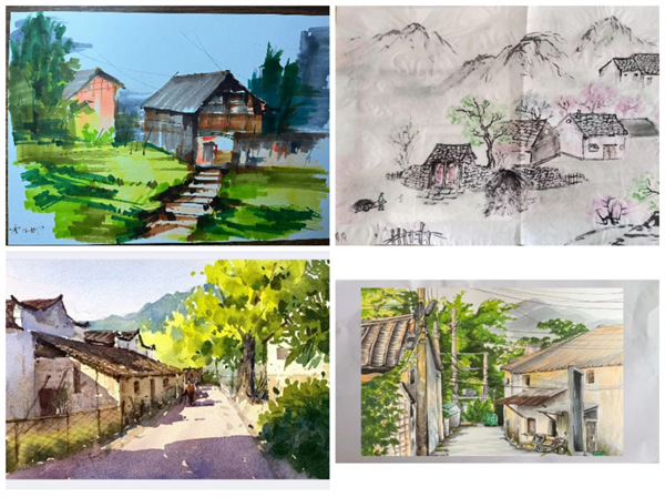 (图片为2021级绘画2班霍钰栋作品《平凉七府村》,2021视觉传达2班张倩倩作品《平凉关山古道》,2022级环设2班邵敏敏作品《宁县盘克街道一角》,慕倩倩作品《环县环城镇街景》)