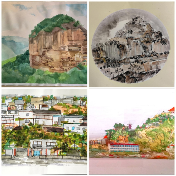 (图片为2022级绘画专业王静作品《天水麦积山》,2022环设2班骆思雨作品《丰收之后》武山县关山村,2022环设2班包玉珍作品《天水市高楼镇街景》,2022级环设2班刘环作品《秦安县凤山公园》)