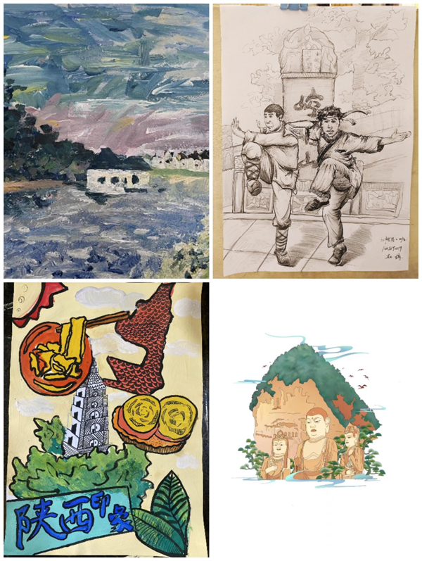 (2022级视传2班刘敏作品《天水家乡河畔》、杜娟作品《平凉崆峒山武术》、党楠作品《陕西印象》、周翔作品《甘肃省天水市麦积区麦积山石窟》)