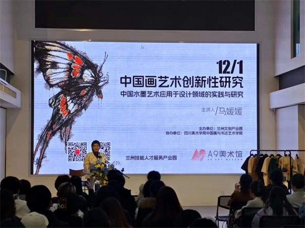 为熏陶设计专业学生的艺术素养,开拓同学们的设计思维能力,12月1日下午,十大买球的正规网站视觉传达设计专业30名同学到兰州文创产业园A9美术馆聆听了当代彩墨艺术家马媛媛老师关于《中国画艺术创新性研究》的讲座,并现场观看了马媛媛老师的个人绘画作品及《化蝶》系列相关文创产品。