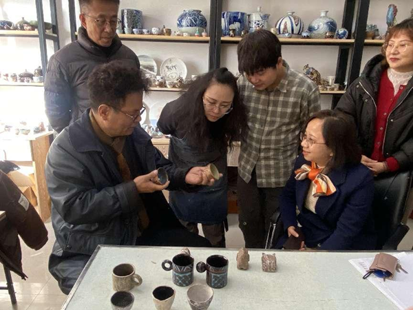 林家阳教授先后走访了陶艺工作室与学院展厅,认真观看了师生作品,对老师和学生在设计创作过程中的钻研与创新精神给予了肯定。同时,从文创产品的艺术造型、创意提升、产品推广等方面做了细致入微的指导,使大家受益匪浅。