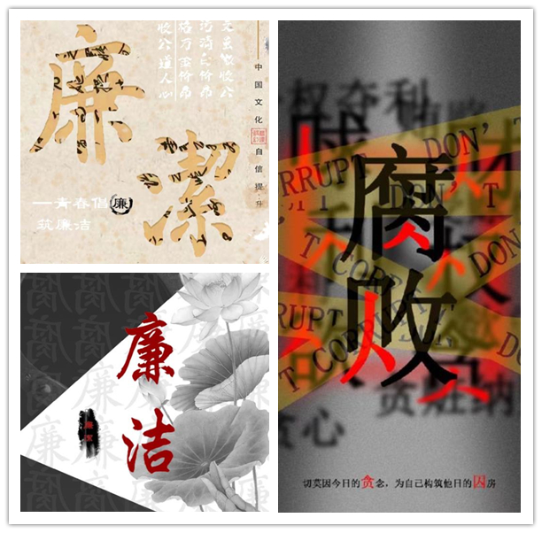 其中展出“反腐倡廉”系列招贴设计作品50幅,“家国情怀”系列排版设计作品30幅。教师对同学们字体设计实践的指导旨在体现汉字的构型之美以及巧妙设计带来的暗喻效果,在版式设计环节中注重版式设计规律与表现技法,主题内容侧重中国传统文化的融合,以美育人。