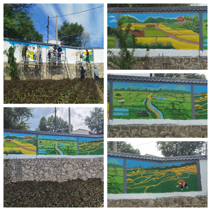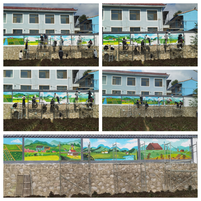本次活动围绕“美丽哈班岔 环境美如画”、“多彩梯田 丰景如画”、“高原夏菜 丰收在望”、“露营康养 天然氧吧”四个主题,同学们在2米高的脚手架上作画,要在长度55米,高度1.8米的墙上,绘制完成长度为4米的画作12幅。
