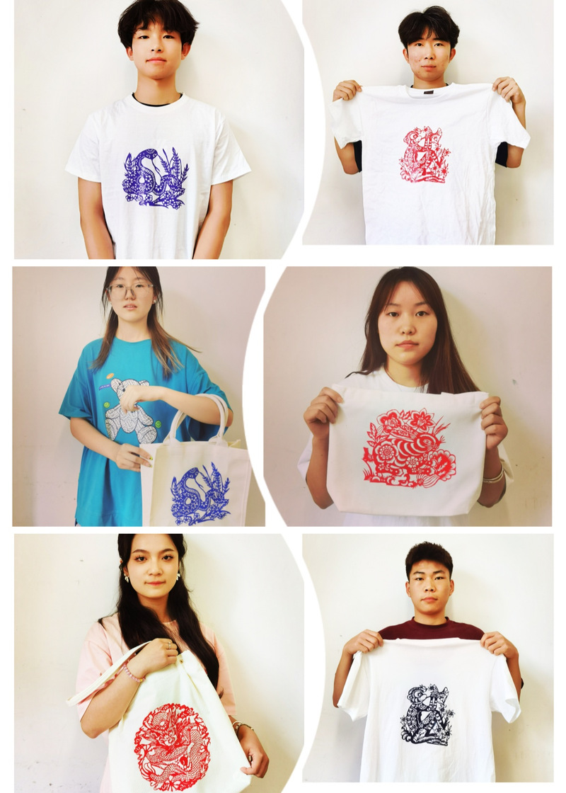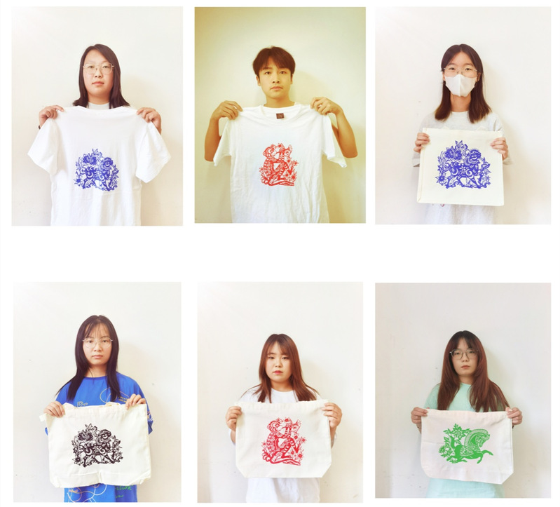 在剪纸新材料应用方面,唐老师购置了剪纸转印纸,选择传统十二生肖图案,让同学们将刻制好的十二生肖通过热转印,印制在白色短袖、帆布包包上,一件件古朴端庄栩栩如生的剪纸文创作品应用而生,同学们在一方文创实物上实践了传统与创新的结合。