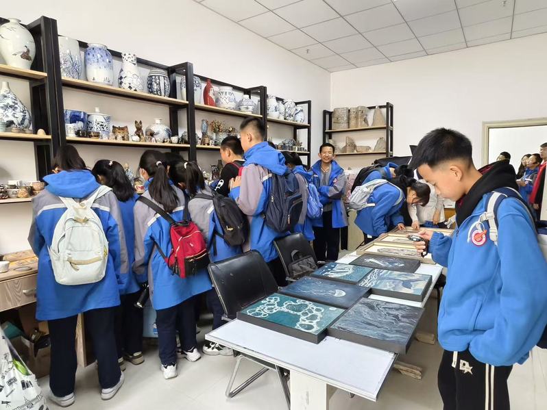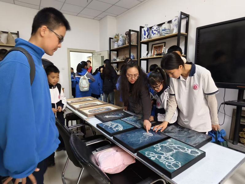 随后,在支部学生党员的带领下研学一行还参观了陶艺和纤维工作室。过程中,同学们欣赏到了许多优秀的陶艺、扎染和掐丝作品,这些作品以其独特的造型、图案、精细的线条和丰富的色彩,展现了传统工艺的独特魅力与无限可能。来访的中学生们对这次参观活动表现出了极大的热情与兴趣,在现场与十大买球官网的党员同学们也展开了热烈的交流。