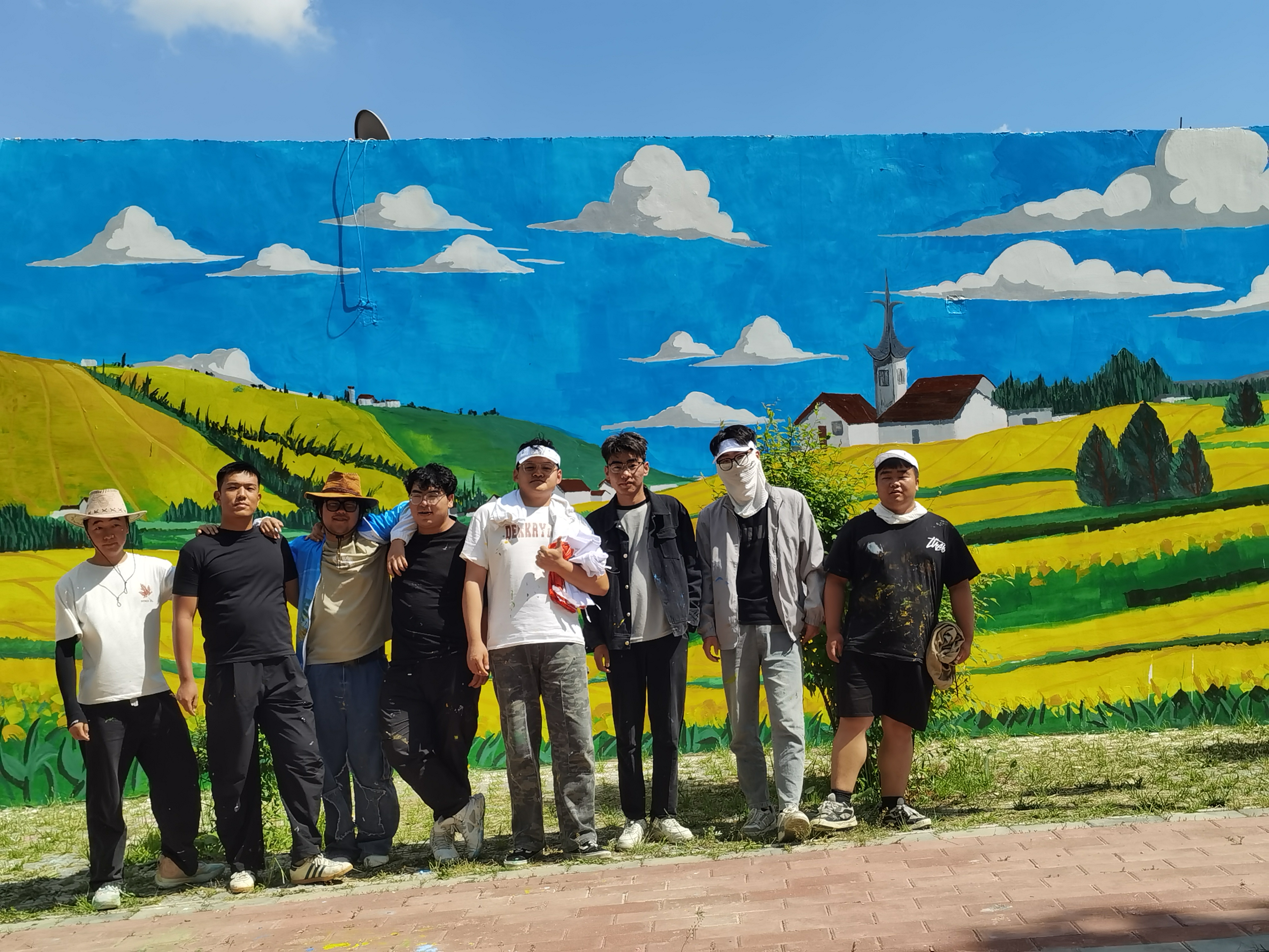 本次活动围绕和美乡村主题,把哈班岔优美的自然环境、绿水青山、梯田丰收场景,在大小不等的5个墙面上大篇幅通体表现,同学们在2米高的脚手架上作画,要在长度60米,高度1.8至4米不等的墙上,绘制完成画作5幅。