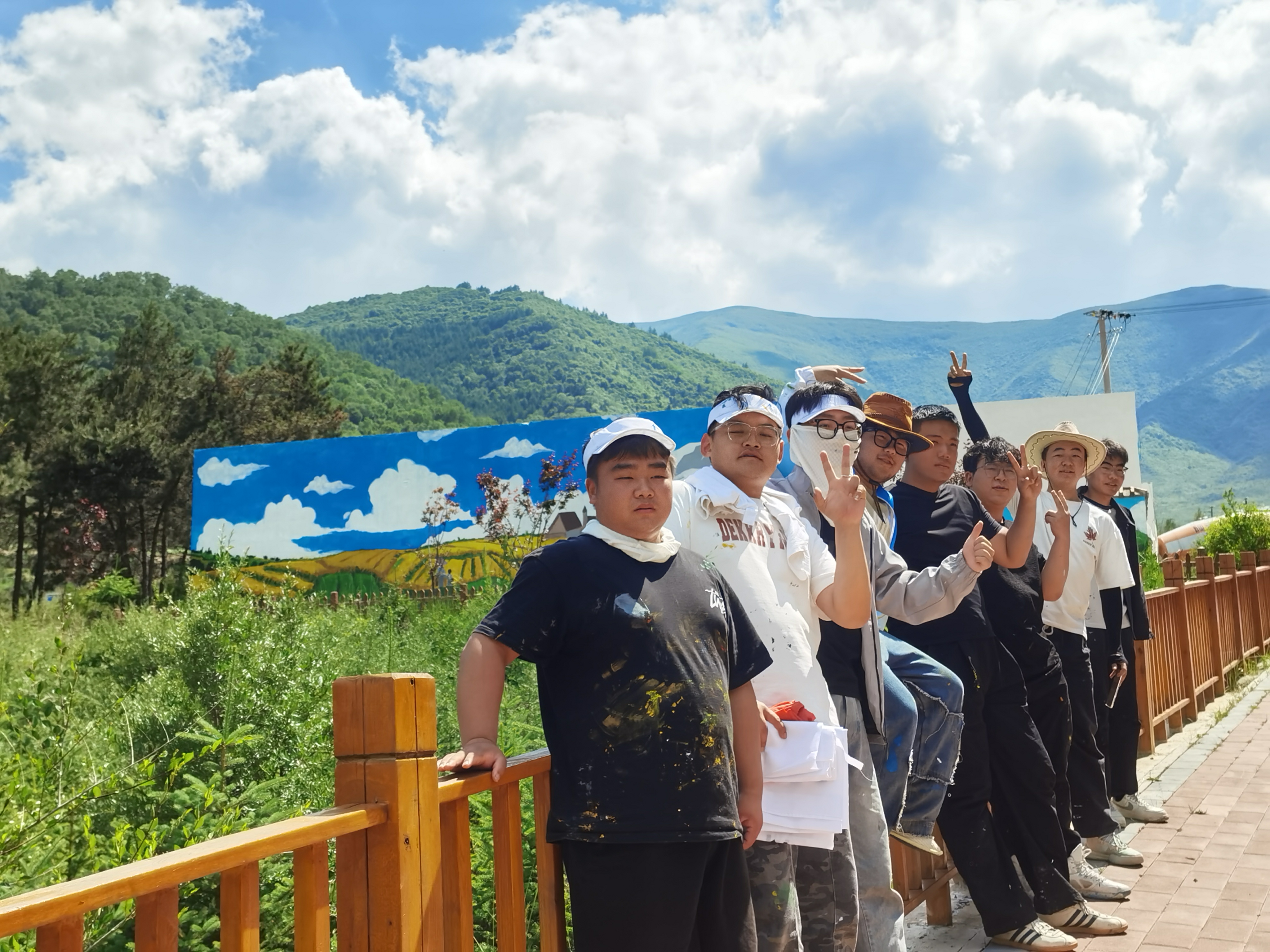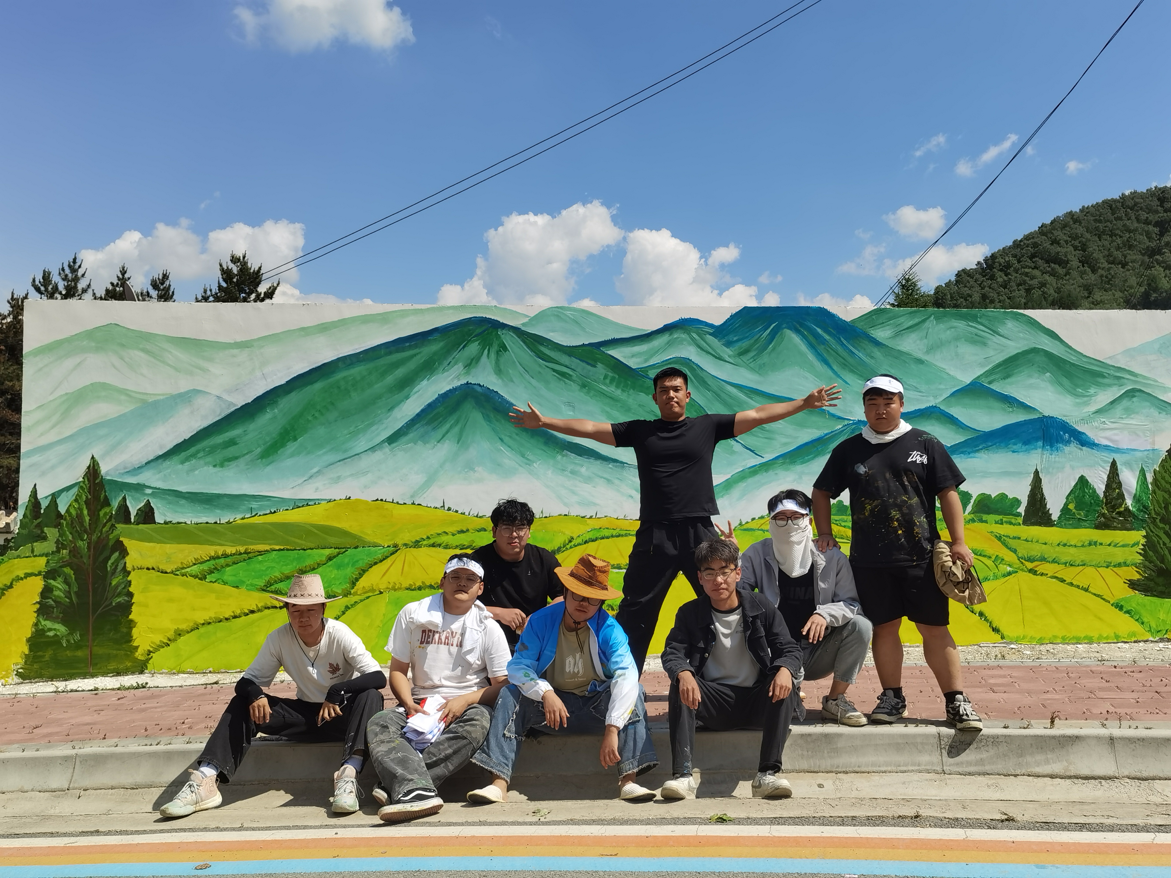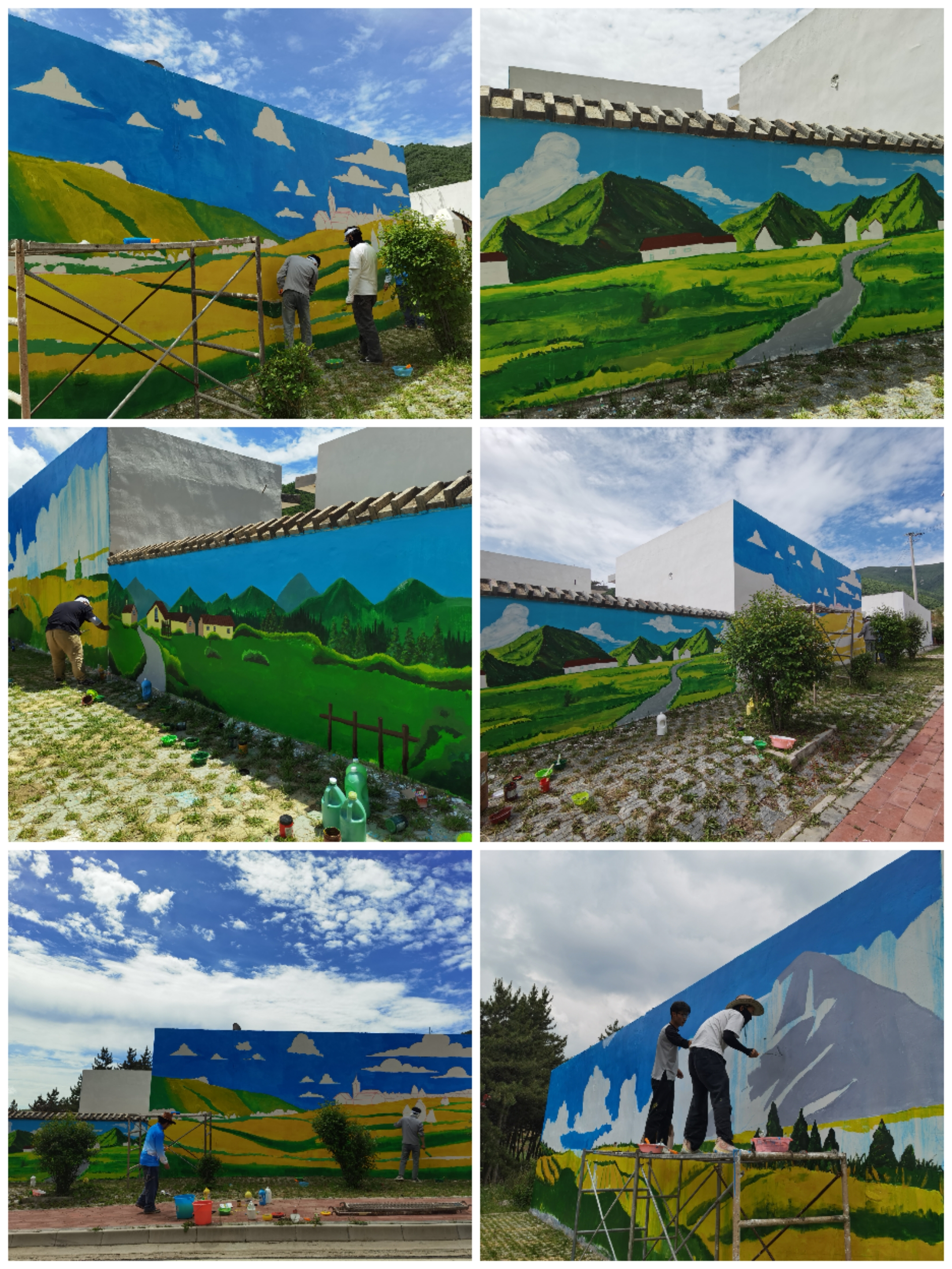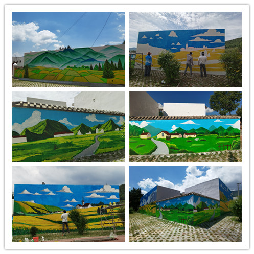 本次活动围绕和美乡村主题,把哈班岔优美的自然环境、绿水青山、梯田丰收场景,在大小不等的5个墙面上大篇幅通体表现,同学们在2米高的脚手架上作画,要在长度60米,高度1.8至4米不等的墙上,绘制完成画作5幅。
