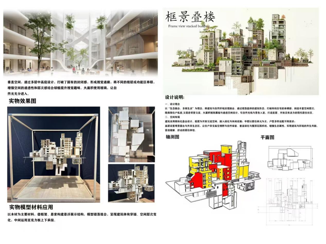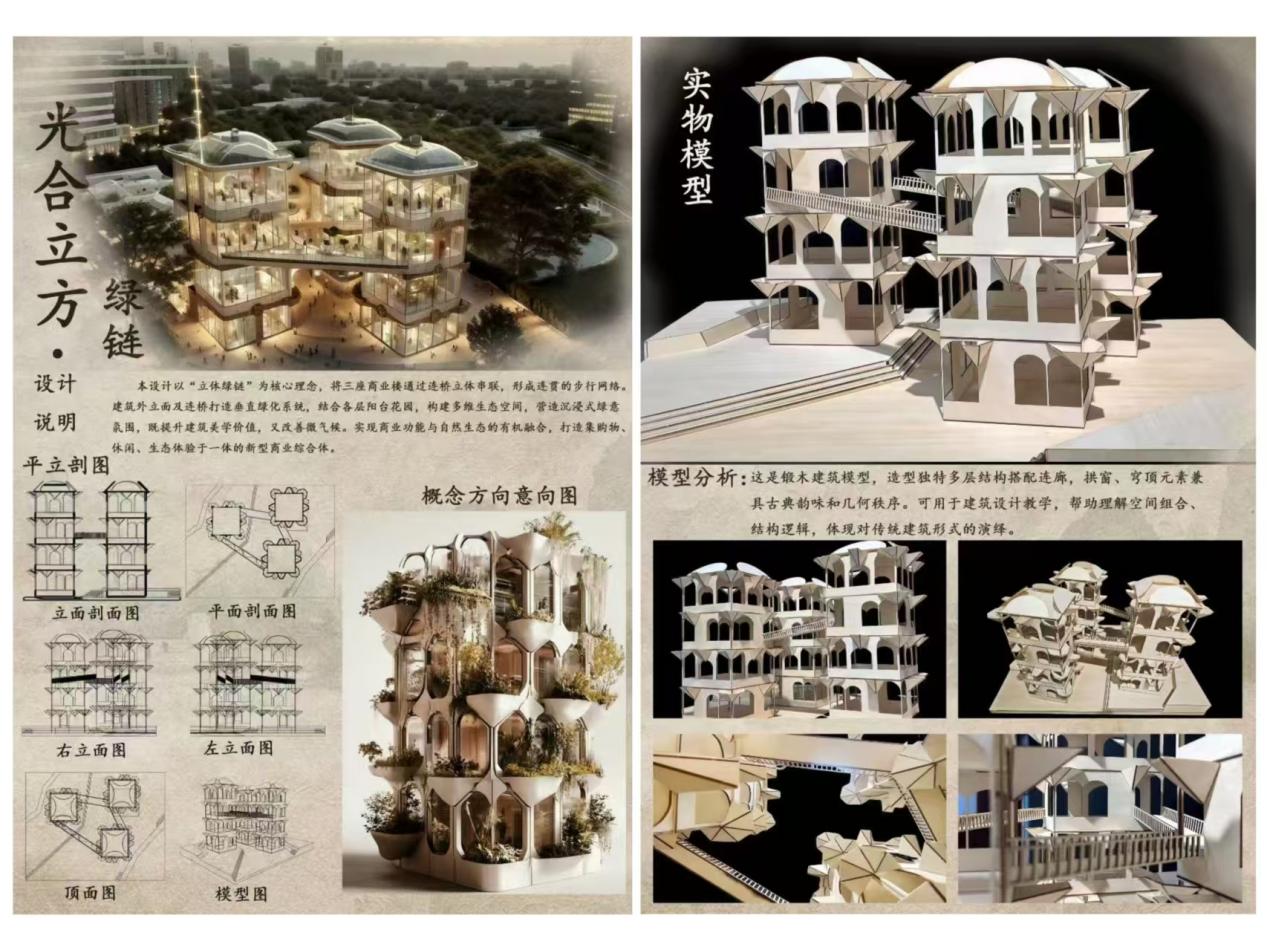 课程初期,教师介绍了当前常用的建筑软件与AI辅助设计工具,引导学生运用AI技术生成概念方案,掌握基础的数字创作技能。随后,通过系统讲解模型制作的基本概念、分类、常用工具与材料等理论知识,学生逐步建立起完整的模型制作知识框架。在项目实践环节,学生通过动手操作,提升了空间想象能力与手工表达能力,学会依据材料特性优化设计方案,并将创意转化为实体模型。在整个设计与制作过程中,课程注重培养学生独立思考、团队协作与实践操作的综合专业素养。