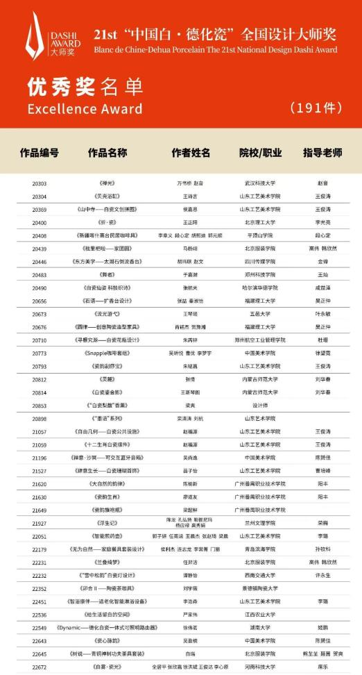 第21届全国设计大师奖由德化县陶瓷发展委员会与全国设计大师奖组委会联合主办,以“德化,为生活留白”为主题,涵盖白瓷生活美学、数字产品、跨界设计等八大类别。赛事覆盖全国28个省市自治区、300余所高校,最终评选出金奖5件、银奖10件、铜奖30件及优秀奖191件。