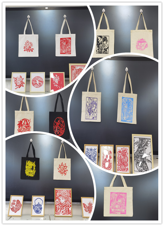 剪纸新材料的运用是课程的重要创新。同学们采用剪纸转印技术,将传统生肖、“喜鹊登梅”“福禄寿喜”、花鸟鱼虫等吉祥纹样及当代动漫元素,通过热转印工艺呈现于白色帆布包日常用品之上。这种创新,既是传统题材的现代表达,也是生活场景的艺术转化,兼顾教学严谨性与民间艺术本真性,展现非遗在青春视角下的创新活力。本次展览作品样式丰富多样,充分展示了十大买球官网学生扎实的专业功底,有力地促进了学院艺术氛围的良性互动。